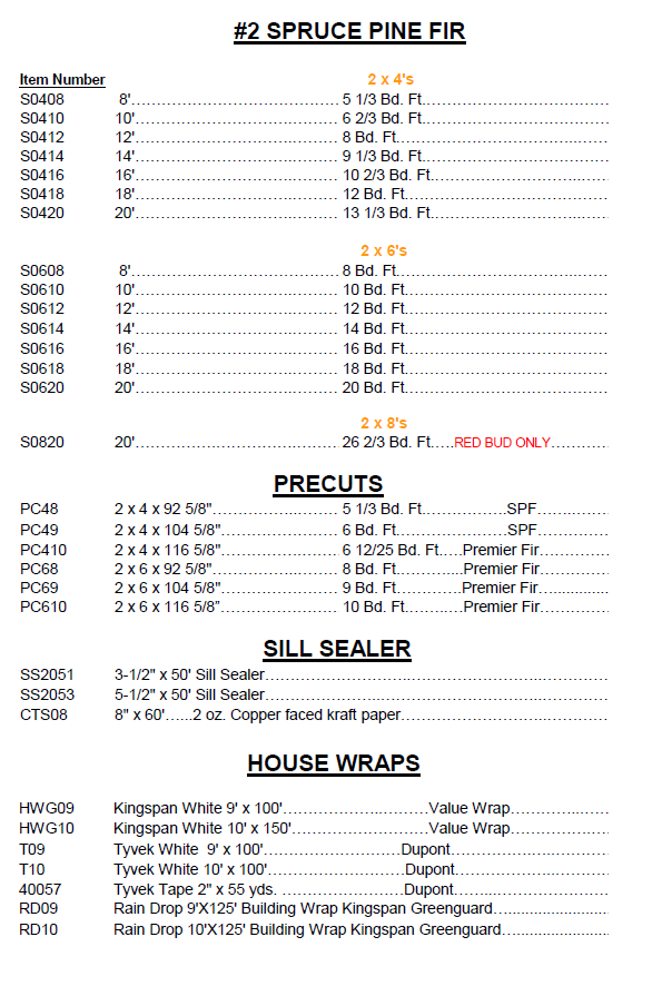 2x4, 2x6, 2x8, 2x10, 2x12, house wrap, spf, tyvek, sill sealer, stair tread, yellow pine